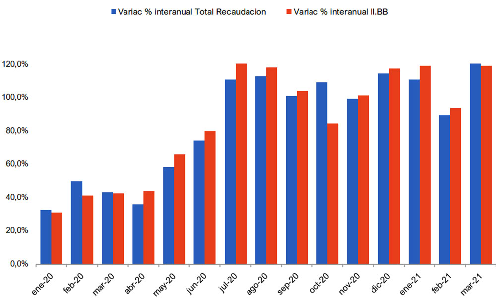 De hecho, en los últimos once meses, Ingresos Brutos tuvo un crecimiento mensual promedio del 102,1%, y solo en los tres meses del 2020 el alza promedio mensual es del 110%.