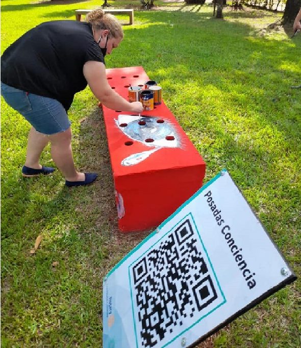Se trata de la señalización de uno de los bancos ubicados en predio del Campus Universitario, en Posadas, pintándolo de color rojo; y la colocación de una placa con el código QR desde donde se puede descargar el texto de la Ley Micaela.