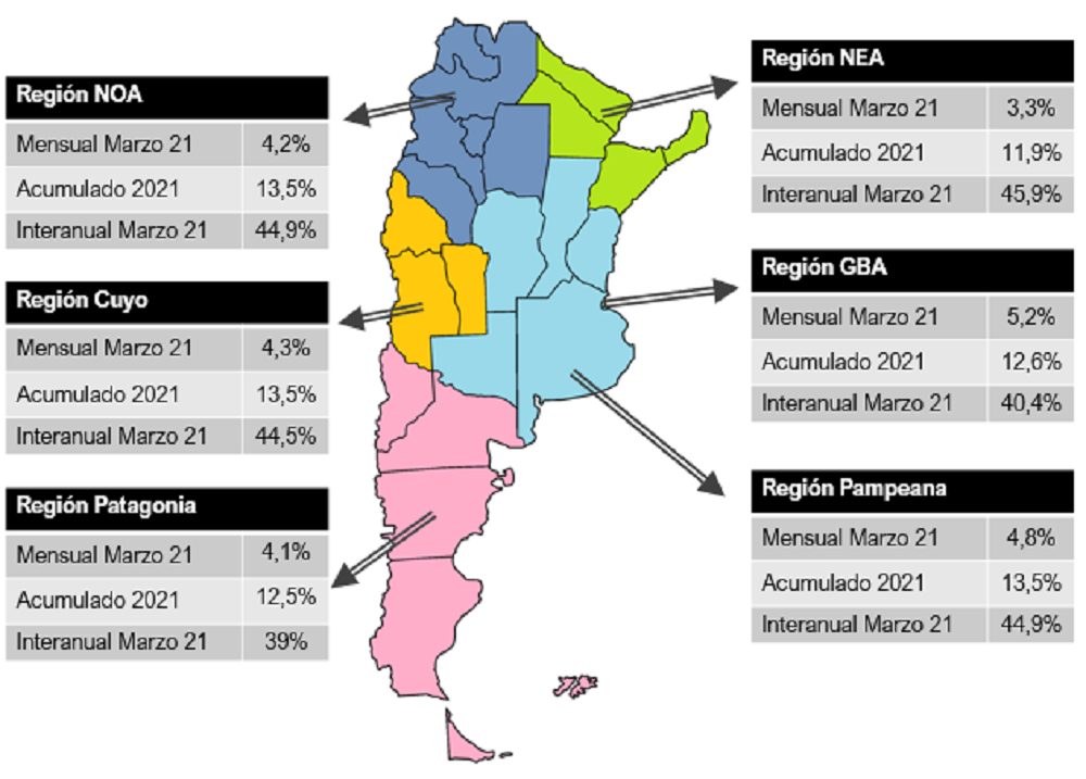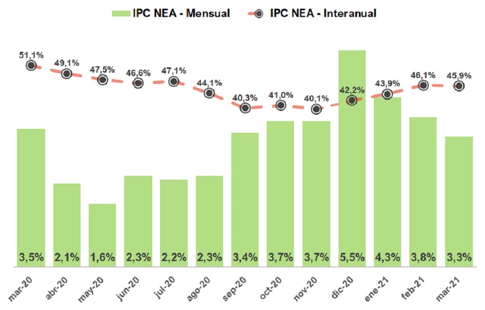 Sin embargo, comparando marzo de 2021 contra marzo de 2020, se mantiene como la región con mayor aumento del IPC en un año, con un 45,9%.