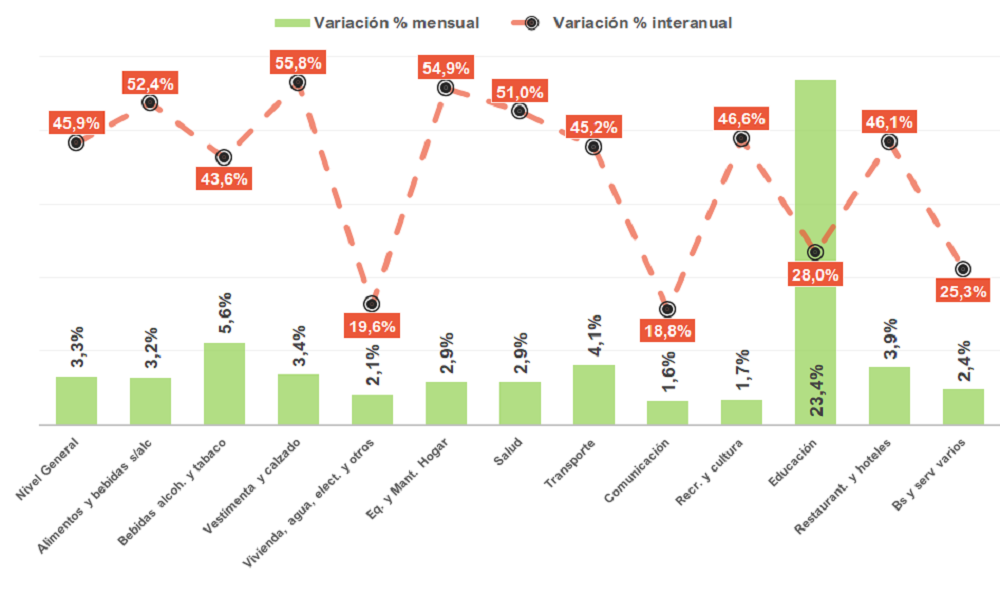 En el otro extremo, la división de “Comunicación” (+1,6%), “Recreación y cultura” (+1,7%) y “Vivienda, gas, electricidad y otros” (2,1%) registraron los menores incrementos.