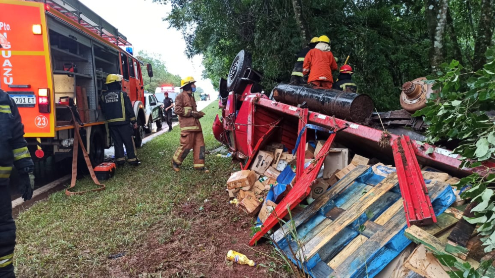 El camión quedó “patas para arriba” en uno de los márgenes de la RN12 y los dos ocupantes terminaron con escoriaciones. Fueron trasladados al Hospital SAMIC de Iguazú para sus curaciones.