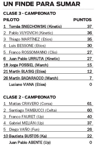 Respecto a la Clase 2, Bautista Bustos (Ford Ka) es de mejor desempeño tras las dos primeras fechas y marcha décimo en el campeonato. Ayer, en el primer entrenamiento, el piloto del JT Racing fue sexto, mientras que terminó octavo en el segundo. A su turno, el posadeño Juan Pablo Abente (Up) fue 33º y 37º, respectivamente.