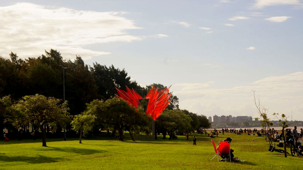 El texto del cartel que acompaña a “Rojo Flor” dice: “Miles de flores del ceibal sueñan, con ser parte de una flor roja gigante, como el sol que inaugura el día, desde el horizonte del río”.