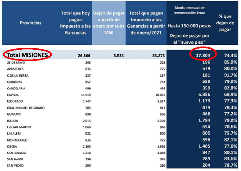En Misiones, de esa cifra, dejarán de pagar el gravamen aproximadamente 17.304 empleados y jubilados, de acuerdo a un informe que se analizó en las comisiones del Congreso, antes de sancionar la norma.