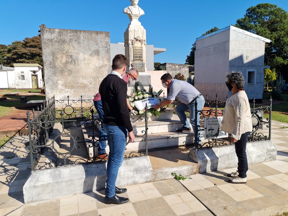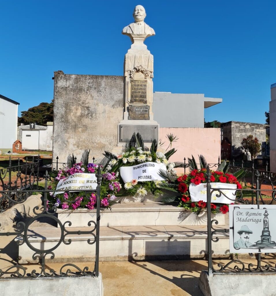 La ofrenda floral se realizó en la placa ubicada en el Mausoleo del Dr. Ramón Madariaga en el cementerio La Piedad. Es el único busto que existe en el camposanto posadeño, tallado en mármol de Carrara, en una sola pieza, cercado con una reja de hierro.