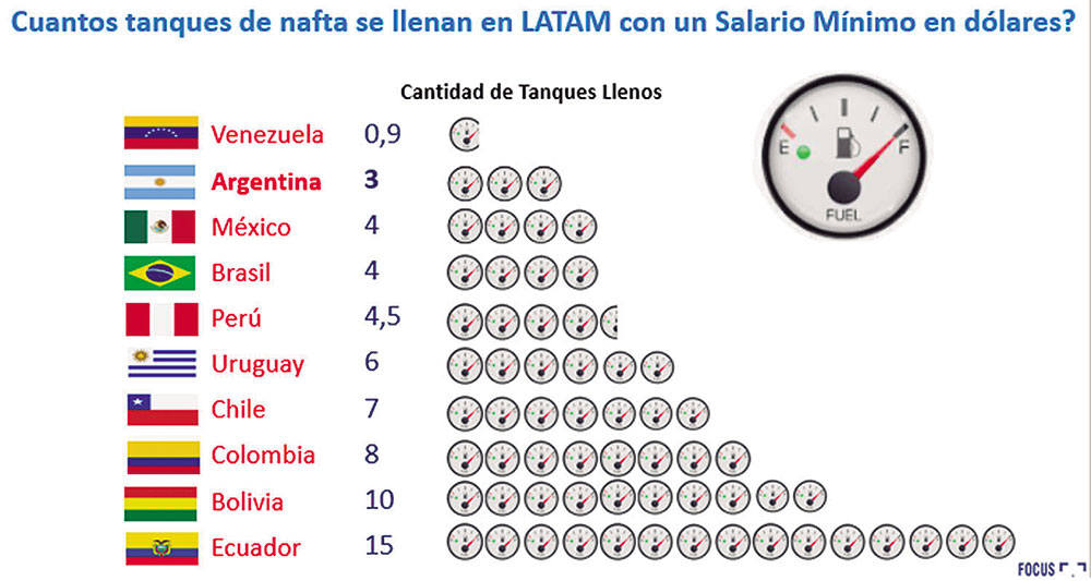 En Bolivia, mientras tanto, un salario mínimo alcanza para llenar diez veces el tanque de nafta, en Colombia para ocho veces y en Chile, siete veces, más del doble que la Argentina.