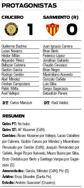 Parecía que el juego tenía como destino un empate y con los cambios Sarmiento comenzó a cerrar ese resultado, pero lejos de conformarse con un punto Crucero buscó y buscó hasta que encontró: a los 47’ Tarrito Pérez, mandó el centro, Klusener remató de primera y la pelota dio en el cuerpo de Gallardo. El balón quedó boyando, Motta la volvió a meter al medio y Toti entró como un toro, atropellando todo a su paso, para empujar la pelota y marcar así el agónico y definitivo tanto del Colectivero.