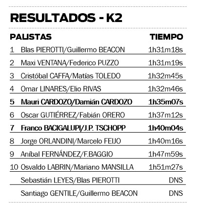 La dupla conformada por Mauricio Cardozo-Damián Cardozo finalizó en la quinta ubicación con una marca de 1h35m07s; mientras que Franco Bacigalupi-Juan Pablo Tschopp llegaron en el séptimo lugar con un registro de 1h40m04s.