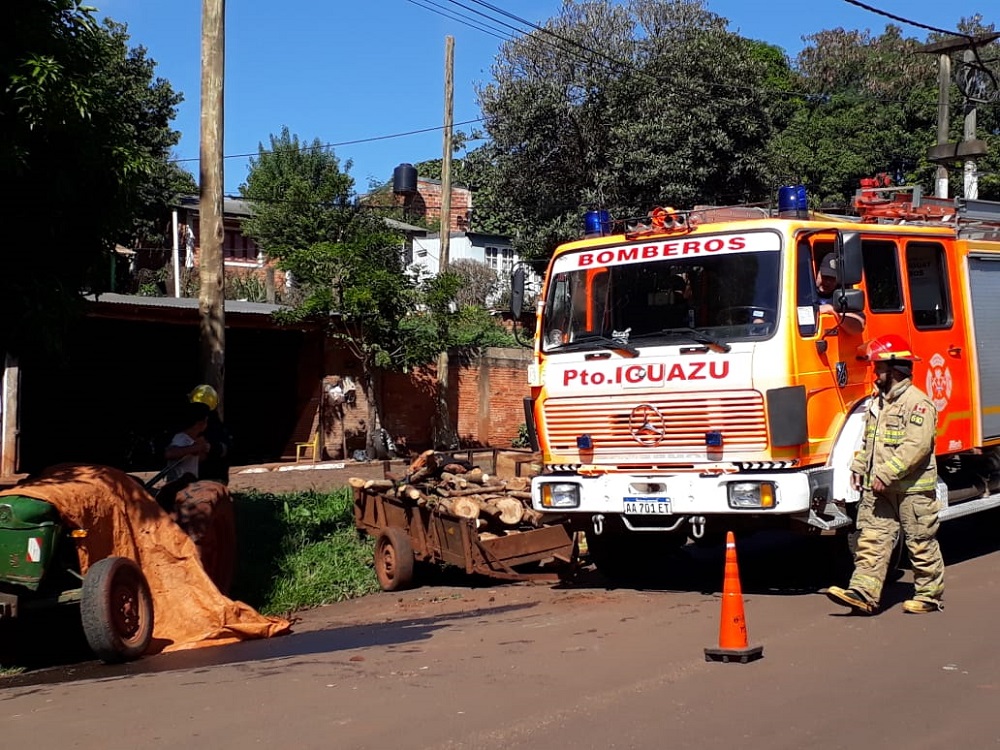 Este lunes por la mañana, aproximadamente a las 10:55, los Bomberos Voluntarios de Iguazú recibieron la denuncia sobre el vuelco de un tractor sobre la calle Felipe Varela.