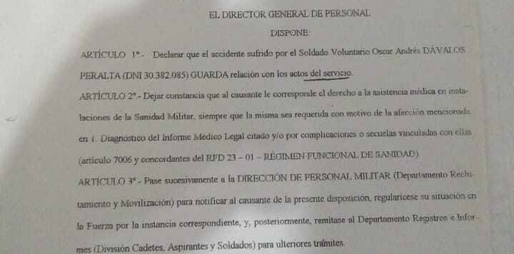 “Estábamos en maniobra de material explosivo, es decir su desarme, algo que no teníamos que hacer pero seguíamos instrucciones de un superior. Cuando mi jefe, a cargo del pelotón, se da cuenta que una granada iba a explotar se lanzó encima para cubrir el impacto y por supuesto falleció al instante. Del resto de los presentes – éramos cuatro – a mi me quedaron las secuelas más fuertes”, relató Dávalos Peralta quien optó por hacer pública su historia para que se destrabe la demanda judicial.