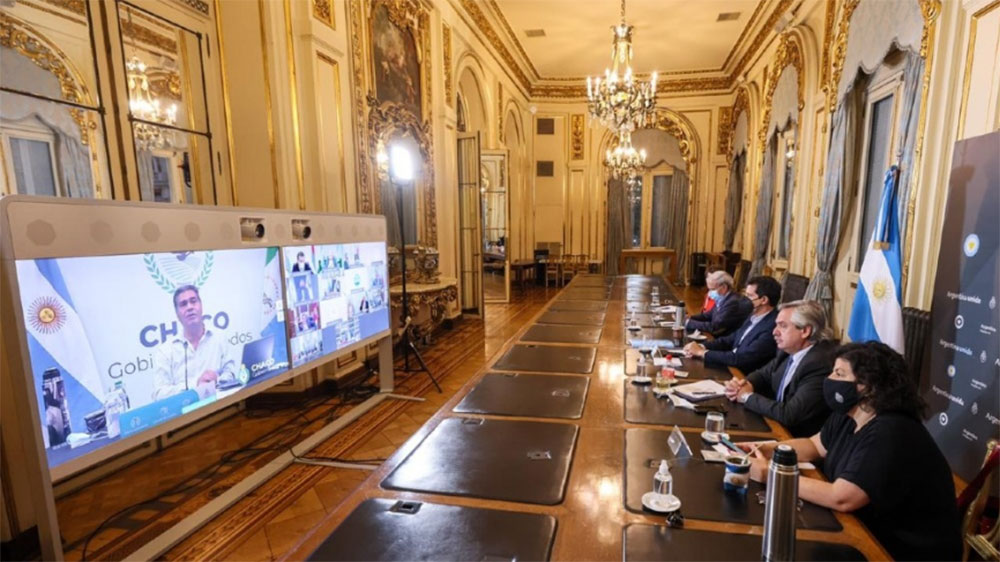 El mandatario realizó la comunicación virtual desde el Salón Norte de Casa Rosada, acompañado por la ministra de Salud, Carla Vizzotti; el ministro del Interior, Eduardo de Pedro, y el secretario general de la Presidencia, Julio Vitobello.