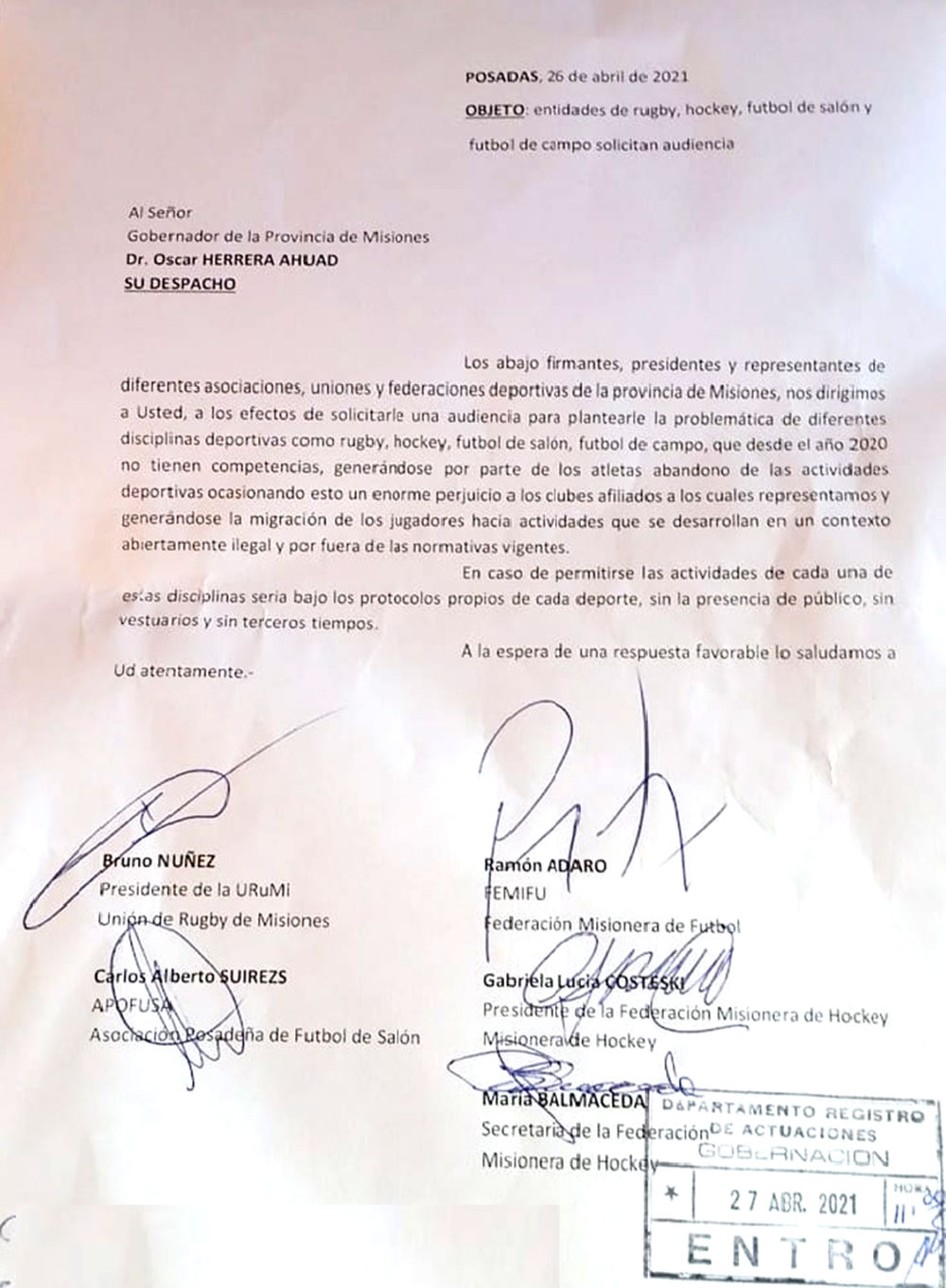 “Nos dirigimos a usted a los efectos de solicitarle una audiencia para plantearle la problemática de diferentes disciplinas deportivas como rugby, hockey, fútbol de salón y fútbol de campo, que desde el año 2020 no tienen competencias, generándose por parte de los atletas abandono de las actividades deportivas, ocasionando esto un enorme perjuicio a los clubes afiliados a los cuales representamos y generándose una migración de los jugadores hacia actividades que se desarrollan en un contexto abiertamente ilegal y por fuera de las normativas vigentes”, explicaron en el documento, al que EL DEPORTIVO tuvo acceso, y donde las entidades firmantes se comprometen a respetar los protocoles vigentes y, además, llevar adelante la competencia sin público.