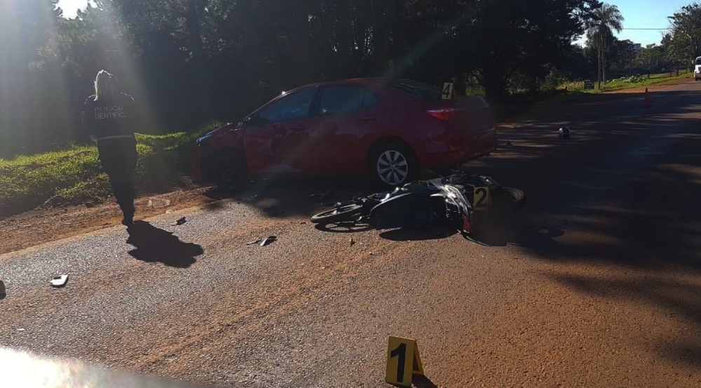 Esta mañana, en la intersección de la ruta provincial 5 y avenida Dos Bosco, por causas que son materia de investigación de los peritos, colisionaron un vehículo Toyota Corolla, guiado por un jubilado de 87 años y una motocicleta de 110 cc, al mando de una persona de 39.