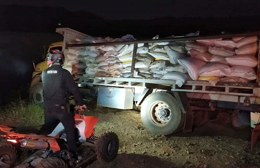 En la misma zona pocos minutos después, fue detectado un camión sobre la costa y varias personas descargando bolsas. Fueron identificados tres involucrados e incautaron 183 bolsas con 9.150 kilogramos de maíz.