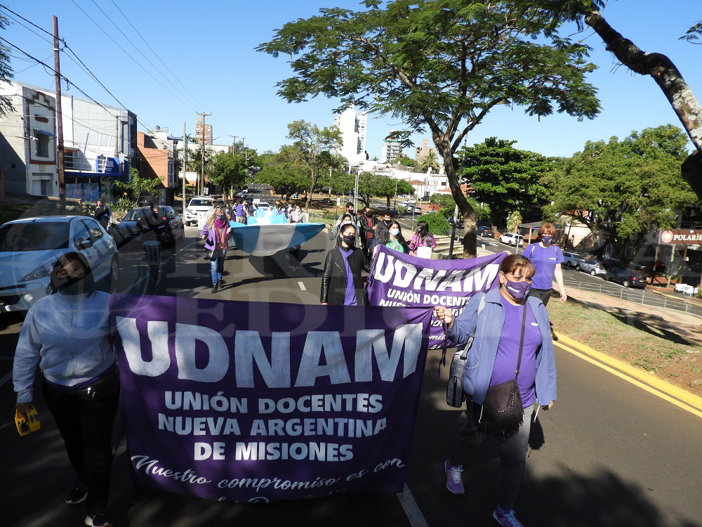 El frente de trabajadores de la educación de Posadas, se movilizan hacia el CGE como medida de fuerza ante su reclamo de recomposición salarial. La convocatoria, que era a las 9 de la mañana, se retrasó casi dos horas pero finalmente decidieron marchar.