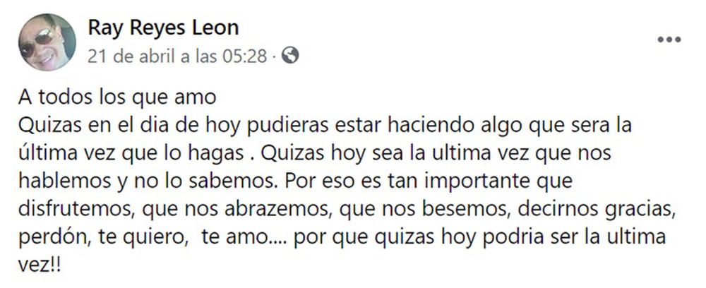 Casi a modo premonitorio, Reyes había subido un posteo que alarmó a sus fans. “A todos los que amo. Quizás en el día de hoy pudieras estar haciendo algo que será la última vez que lo hagas. Quizás hoy sea la última vez que nos hablemos y no lo sabemos. Por eso es tan importante que disfrutemos, que nos abracemos, que nos besemos, decirnos gracias, perdón, te quiero, te amo… Porque quizás hoy podría ser la última vez”, expresó el 21 de abril.