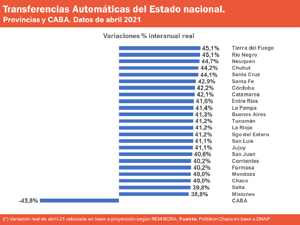 Le siguen Chaco y Mendoza (40%), y Corrientes y Formosa (40,2%). Mientras que todas las provincias, como se señaló previamente, mostraron alzas, la Ciudad Autónoma de Buenos Aires otra vez registró fuertes caídas reales a partir de la quita de puntos de coparticipación que estableció el Gobierno nacional en los últimos meses del 2020. De esa forma, la caída real de la CABA fue del 43,8% en comparación con abril de 2020.