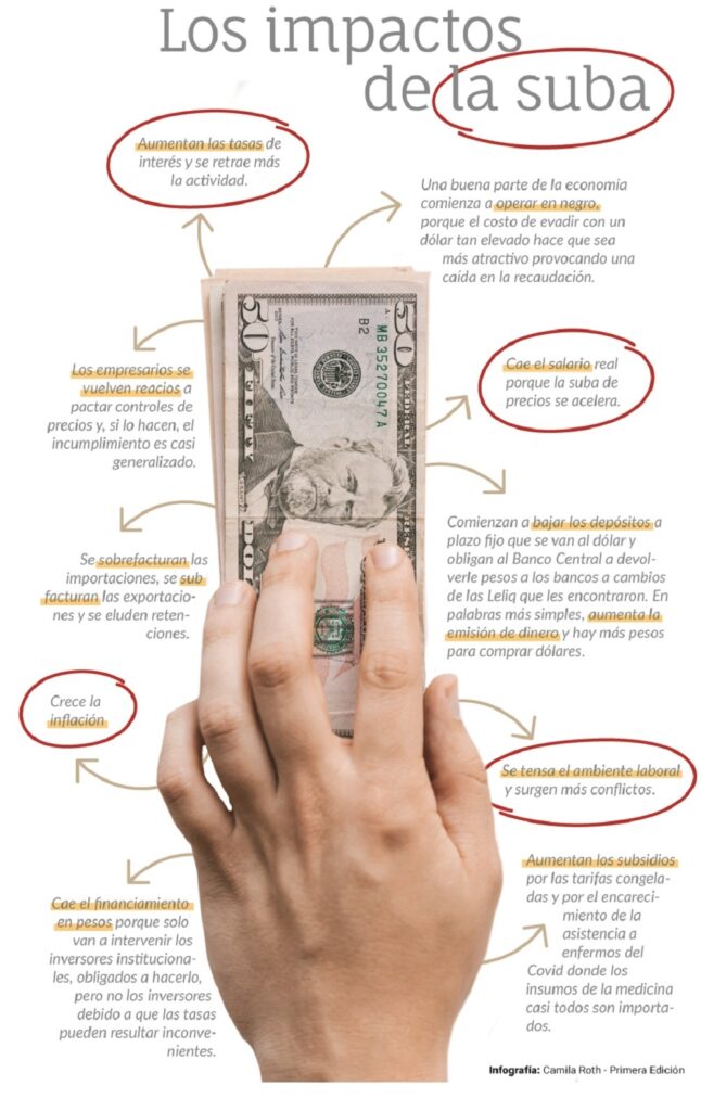 Creo que la inflación va a ser más fuerte que la del año pasado. Probablemente más cerca del 50%, la razón de ello es que la inflación es un fenómeno monetario pero tiene rezagos. Desde hace ya varios años que sabemos que los rezagos inflacionarios van desde los 6 meses de mínima hasta los 15 meses de máxima. Por eso la inflación está haciendo picos hoy, 12 meses después de la cuarentena del 2020 que obligó a una fuerte emisión monetaria. Por otra parte, si las medidas de restricción se endurecen el Gobierno deberá establecer nuevos subsidios que serán financiados con emisión monetaria por el doble efecto del aumento del gasto y de la menor recaudación. Además tengamos en cuenta que hacia adelante todavía hay precios que deben ajustarse como son tarifas de servicios públicos e incluso salarios. Aún así no descarto que en el corto plazo puede haber una desaceleración de la inflación debido al impacto recesivo de las restricciones que imponga el Gobierno.