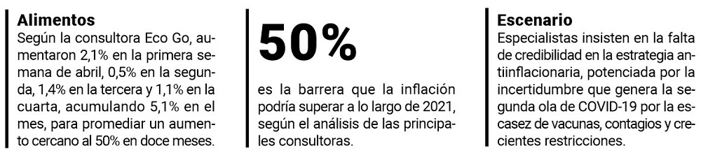 No obstante, el dato de inflación de marzo de 4,8% y un acumulado de 13% en el primer trimestre, deja severamente comprometida la meta oficial: necesita que en los nueve meses sucesivos el promedio mensual se mantenga en 1,5%, un guarismo que consiguió solamente en dos de los últimos 40 meses, los dos más estrictos de cuarentena que paralizaron la actividad.