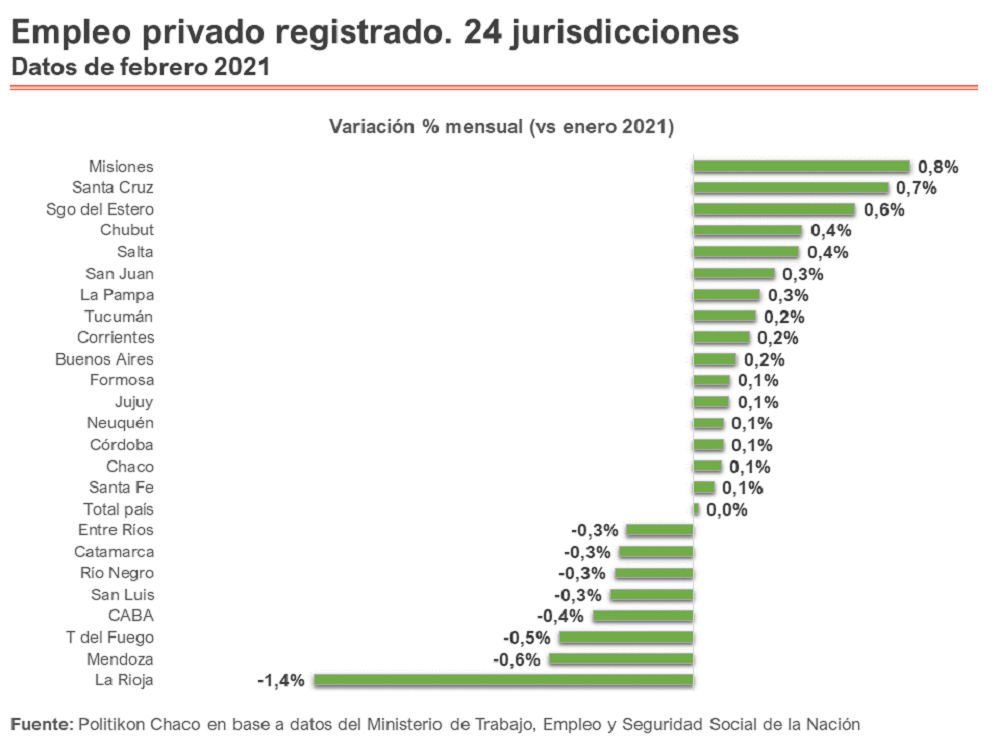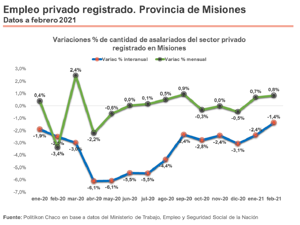 En febrero pasado, el empleo registrado en el sector privado formal misionero experimentó el mayor incremento de todo el país en la comparación mensual; sin embargo, si se compara contra el mismo mes de 2020, todavía muestra retracciones, según indicó un informe realizado por la consultora Politikon Chaco, en base a datos oficiales del Ministerio de Trabajo, Empleo y Seguridad Social de la Nación.