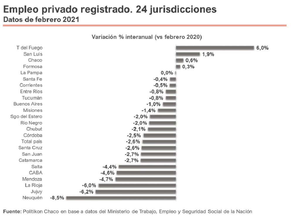 En términos relativos, cuatro provincias registran incrementos (en enero fueron solo dos): Tierra del Fuego, por sexto mes consecutivo, continúa liderando con un alza del 6% (+1.966 empleos), seguida por San Luis, que crece 1,9% (+950 empleos), y se le suman Chaco con +0,6% (+402 empleos) y Formosa con +0,3% (+73 empleos), todo en relación a febrero 2020.