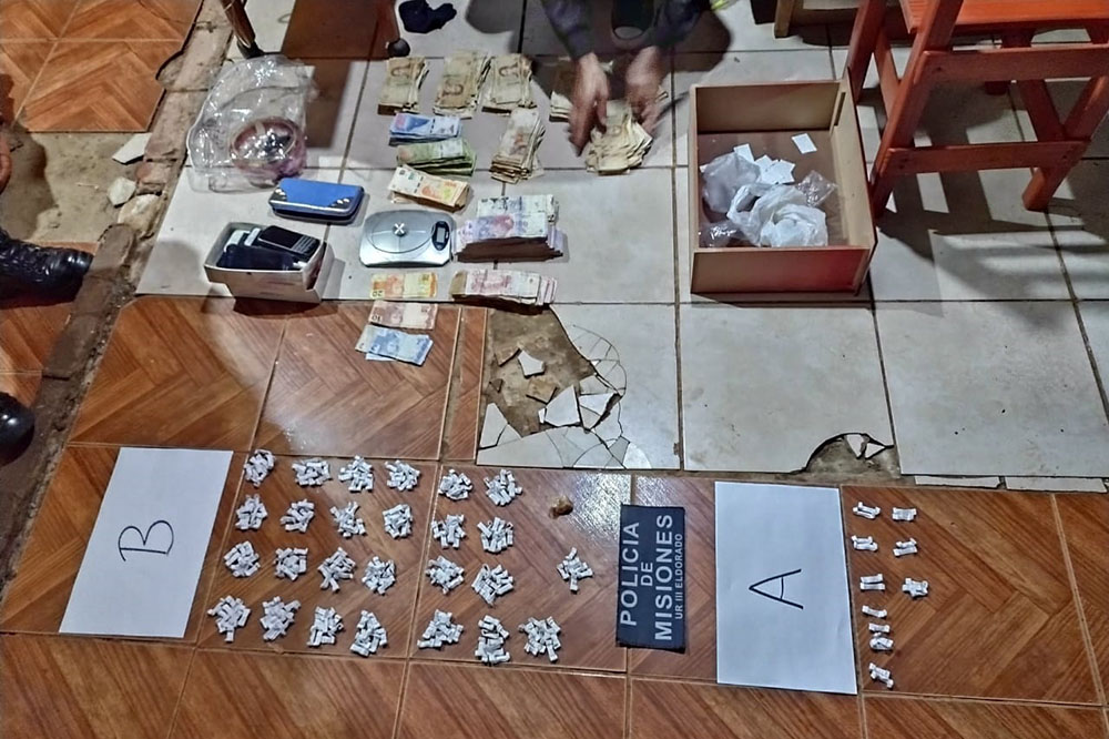 En la primer vivienda allanada, en el barrio 17 de Agosto de Montecarlo, la policía dio con más de 270 envoltorios de clorhidrato de cocaína en forma de piedra con un peso de 75 gramos, casi 120 mil pesos argentinos en efectivo y 70 reales. Entre otros elementos, secuestraron tres teléfonos celulares y tres tablets y de acuerdo a testimonios de vecinos, en el lugar se comercializaba droga al menudeo. El propietario, un hombre de 41 años fue detenido.
