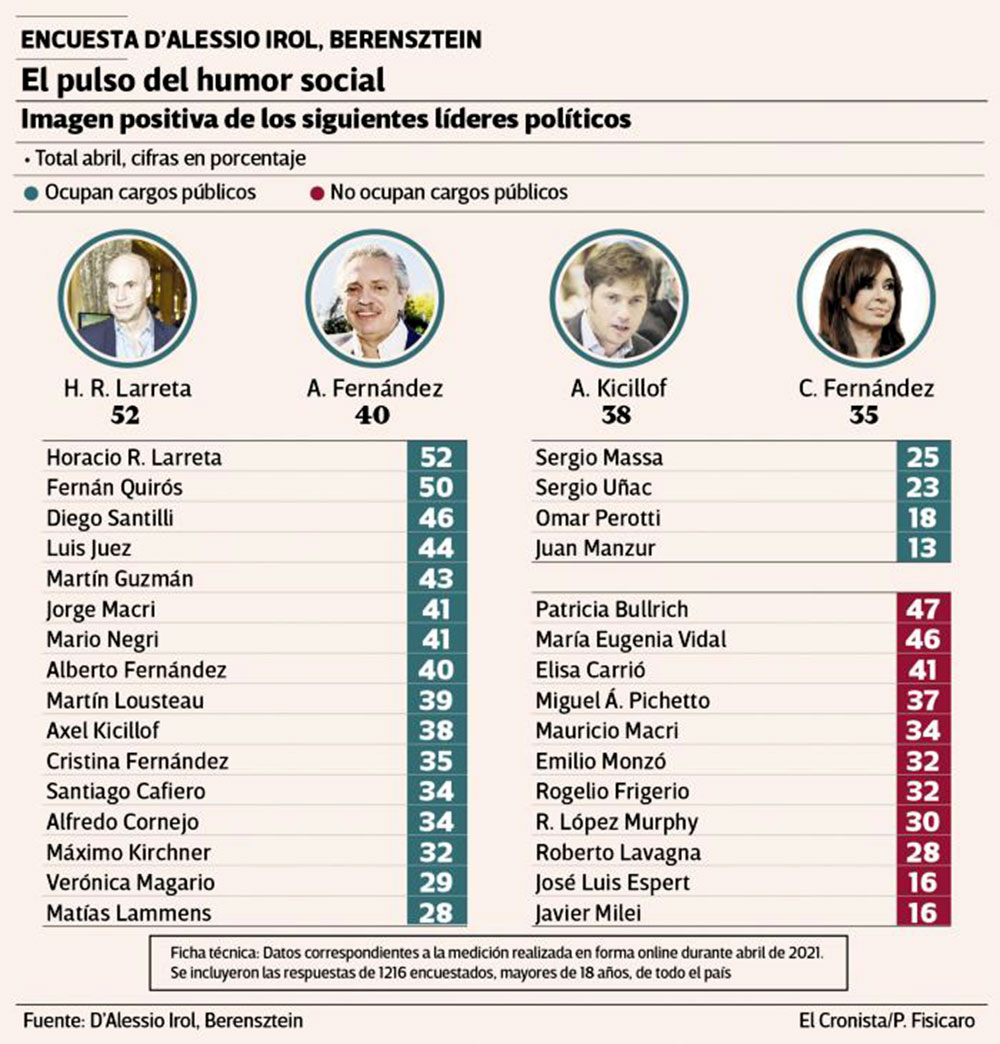 El dato acompaña al estancamiento de la imagen presidencial, que se mantiene con un balance negativo de 17 puntos (40 puntos de imagen positiva y 57 de negativa), lejos del +9 que observa el jefe de Gobierno porteño, Horacio Rodríguez Larreta (52 y 43), y del +20 que muestra el ministro de Salud de la Ciudad, Fernán Quirós (50 y 30).