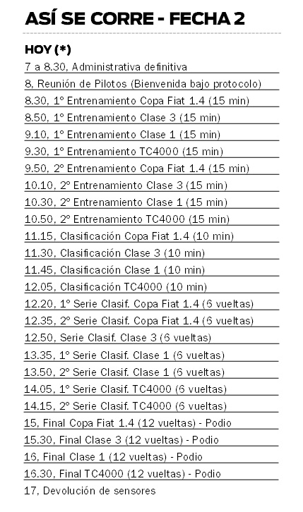 Para el final, aunque no por ello menor, también se reeditará el show de la Copa Fiat 1.4, los mencionados “fititos”, con quince autos en pista y las presentaciones de Martín Correa Álvez, el correntino Juan Aguerre, Gustavo Grun (Wanda) y Guille Guidi (Iguazú).