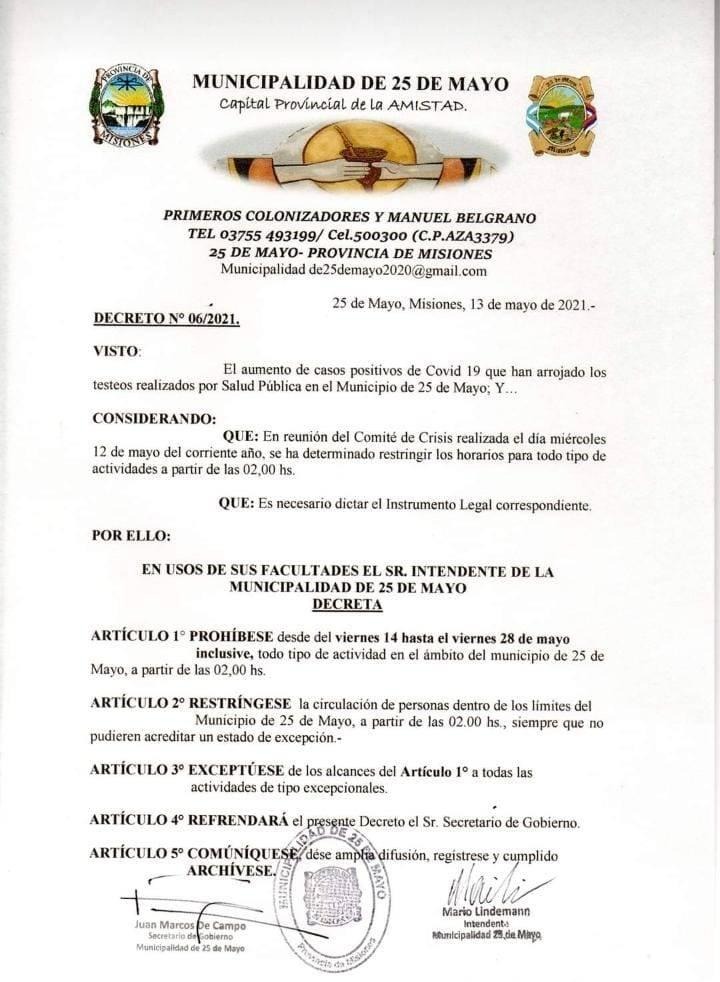De allí surgieron las bases para el Decreto N°6/21, emitido este jueves por la Comuna, en el que se establece que a partir de mañana viernes y hasta el 28 de mayo inclusive quedará interrumpido todo tipo de actividad y circulación dentro del municipio a partir de las 2 de la madrugada, a excepción de situaciones de emergencia acreditadas y aquellos sectores considerados esenciales.