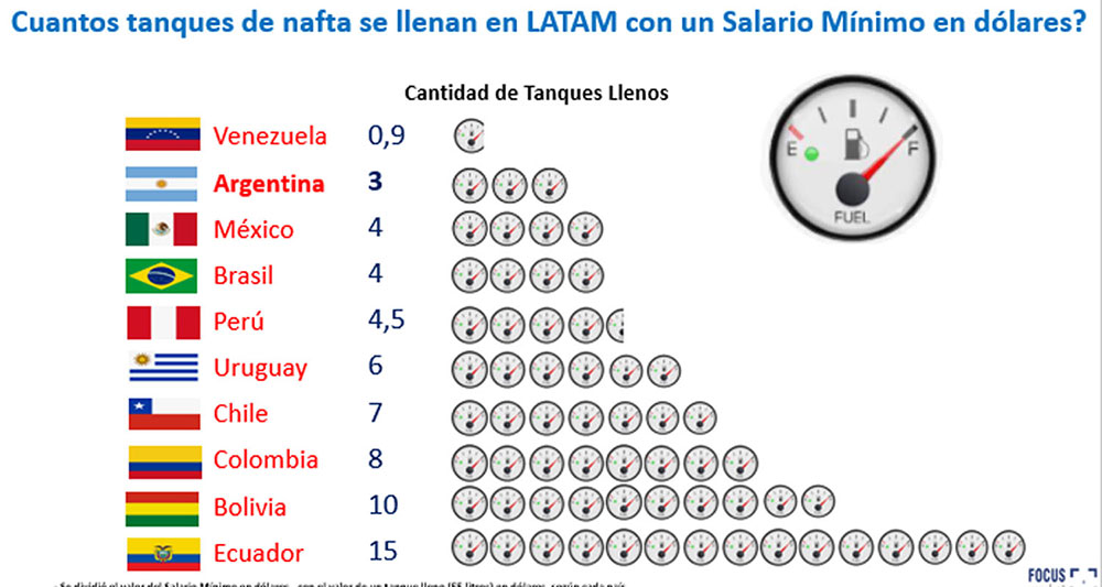 En términos de poder adquisitivo del salario en dólares con el mismo mientras en Argentina se pueden llenar sólo tres tanques de nafta.