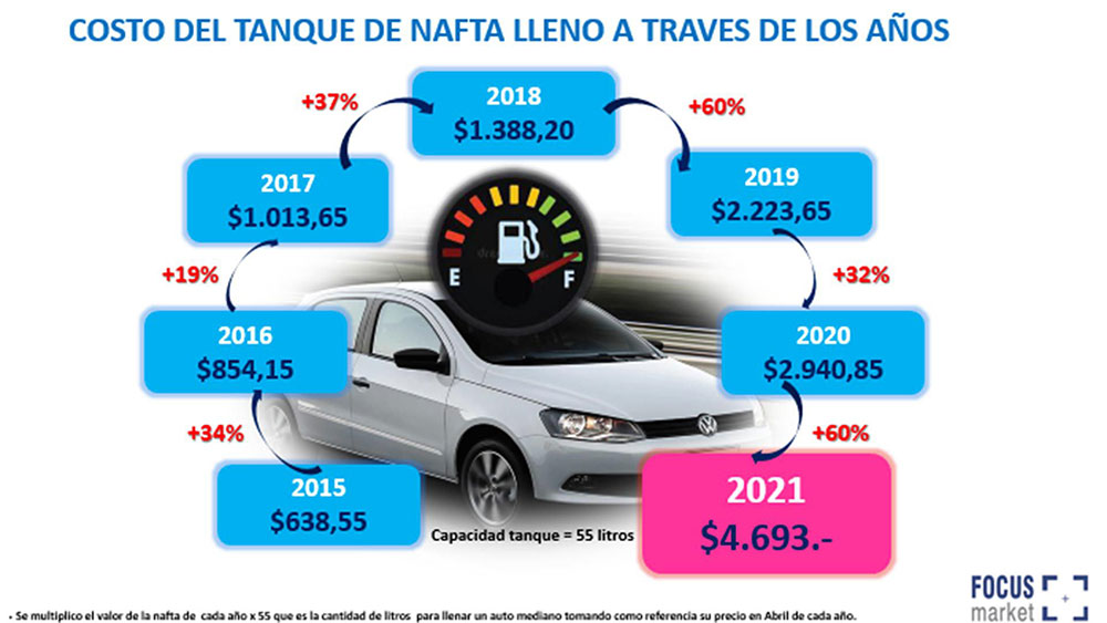Un informe elaborado por Focus Market con el anterior incremento del precio de la nafta advirtió que se necesita gastar, en promedio, 4.693 pesos para llenar un tanque de un auto mediano. En abril de 2020 se llenaba con 2.940 pesos, lo cual implica un aumento del 60 % interanual.