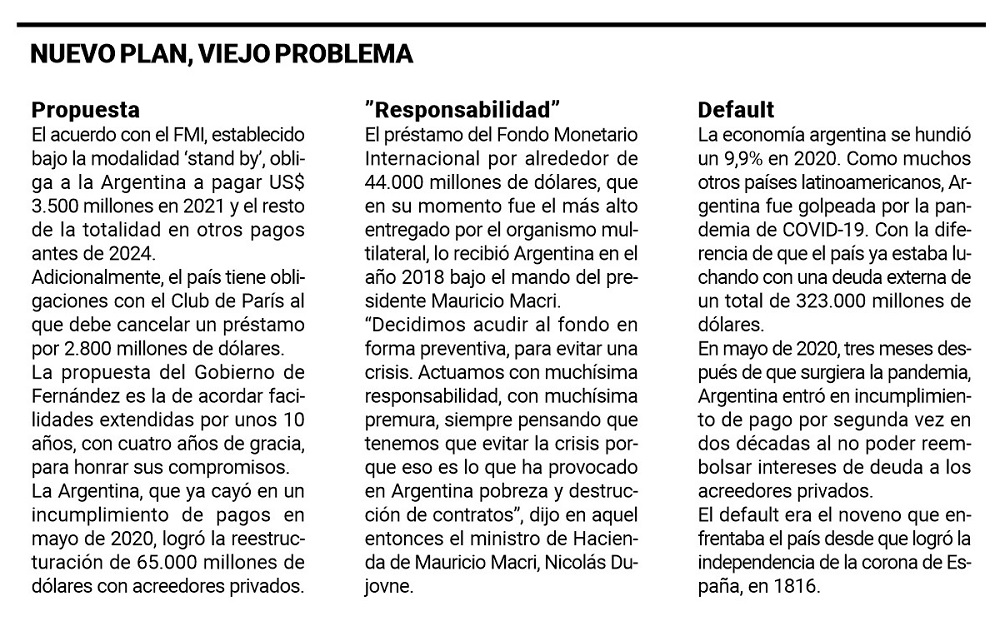 El gobierno trata contrarreloj de cerrar un acuerdo para refinanciar lo que no puede pagar: el préstamo de alrededor de US$ 45 mil millones del Fondo Monetario, que en su momento fue el más alto entregado por el organismo multilateral de crédito a un país.