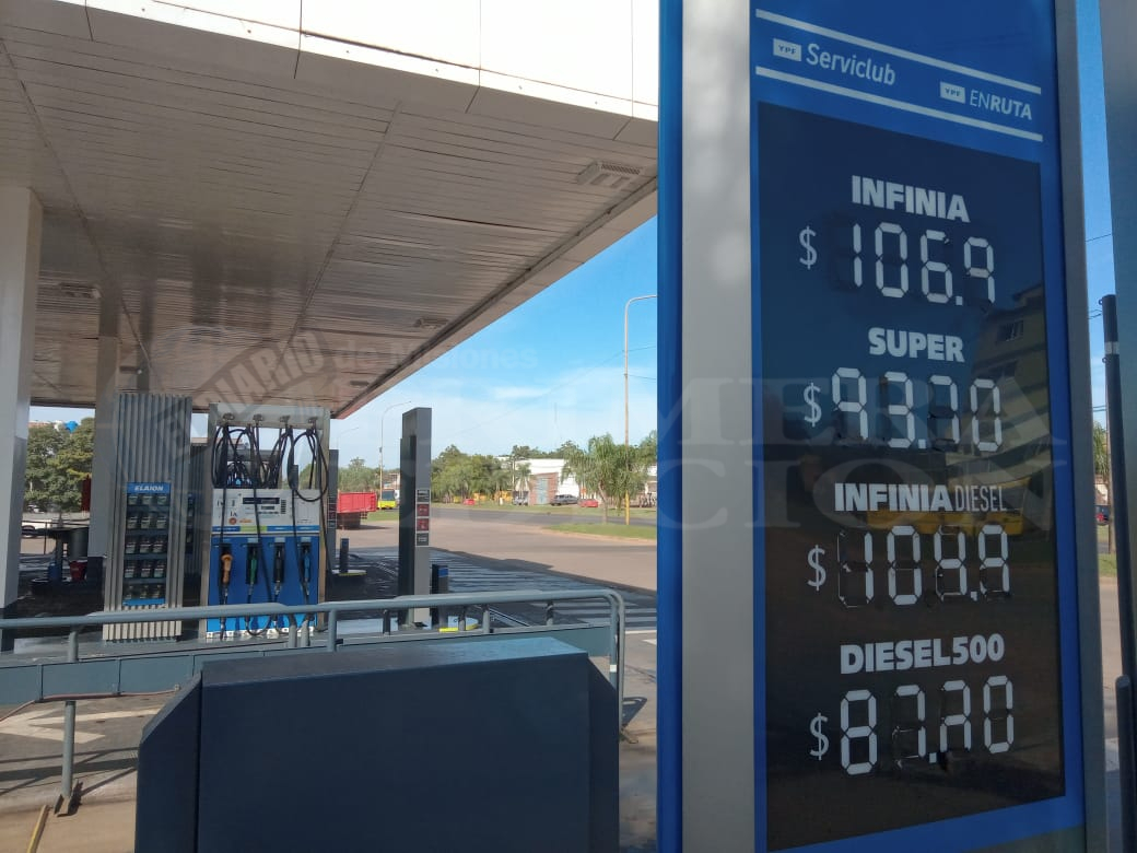 En tanto, en los surtidores de YPF de la ciudad de Posadas, el litro de la premium pasó a costar $106,9, la Súper $93,70, la Diésel $87,90 y la Infinia Diésel $104,9.