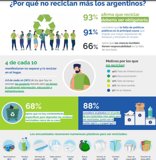 Ramos explicó que los argentinos tienen la “buena voluntad” de reciclar pero “saben poco” sobre el cómo reciclar, dónde llevar los reciclables, qué tipo de residuos se pueden reciclar. “Acá en Argentina no hay una ley nacional de responsabilidad del productor (una ley de envases)”. Dijo que las provincias y municipios hacen lo que pueden, ya que “hay mucho voluntarismo y faltan políticas públicas para que los residuos puedan separarse en los hogares, que sea obligatorio y luego las cooperativas puedan separar y comercializar los fardos”, explicó.