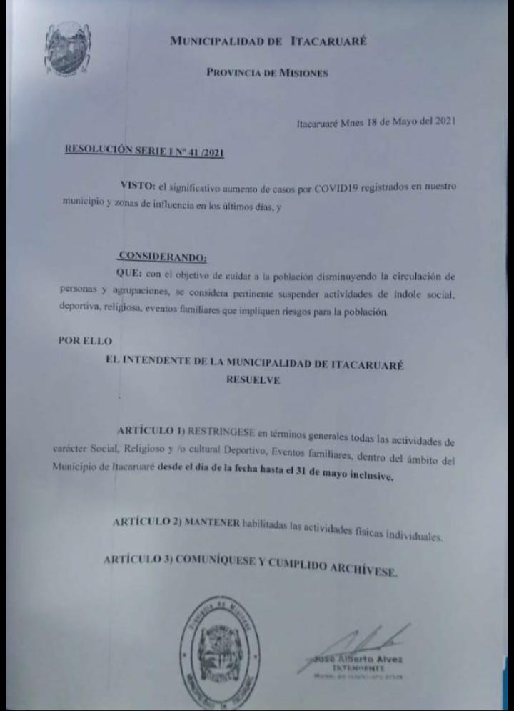 Por ello, el intendente de Itacaruaré, José Alvez, resolvió “restringir en términos generales todas las actividades de carácter social, deportivo y religioso, cultural y familiar, dentro del ámbito del municipio desde el día de la fecha, martes 18 de mayo, hasta el 31 del mismo mes, inclusive”.