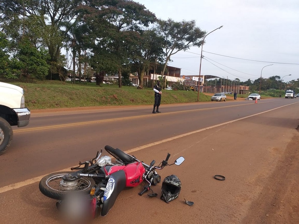 El siniestro vial entre un auto y una moto tuvo lugar hoy miércoles en horas de la tarde, a la altura del kilómetro 875 de la ruta nacional 14, en su intersección con la avenida Gendarmería Nacional de Oberá.