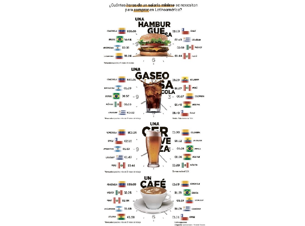 Si se toma como ejemplo a la cerveza, Focus Market señaló que “en Venezuela se requieren 502 horas y 24 minutos, en Chile 2 horas 16 minutos, en Argentina 1 hora 53 minutos mientras en el otro extremo en Ecuador se requieren 1 hora 12 minutos y en Colombia 1 hora”.