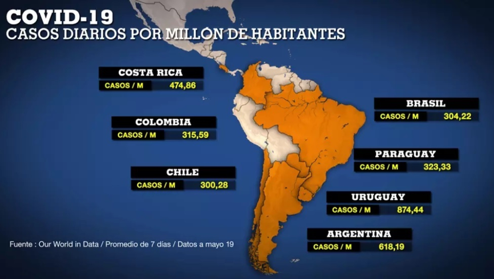De nuevo, Uruguay, con 15,87 decesos a causa del virus por millón de habitantes, está en el primer lugar, seguido de Paraguay (11,14) y Argentina (10,93). Además, están Colombia, que cuenta 9,76 muertes por millón; Perú, con 9,27, y Brasil que registraba a 19 de mayo 9,18.