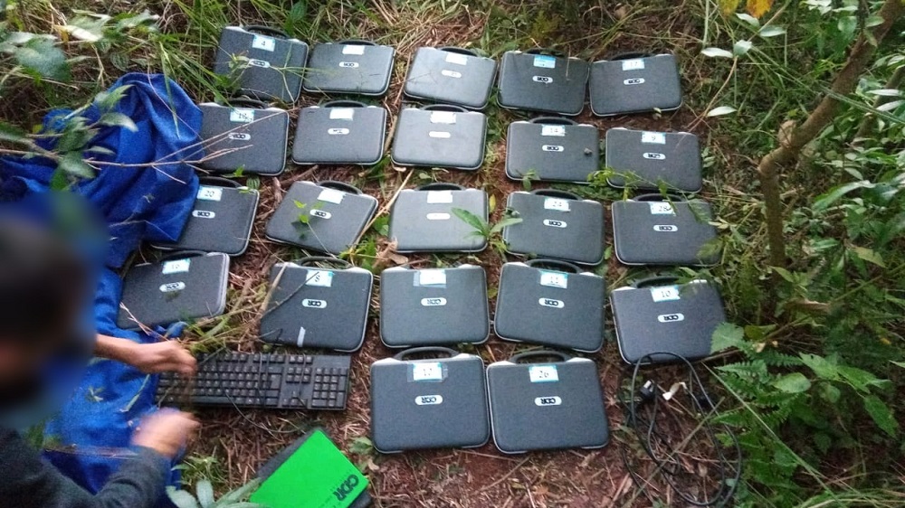 A través de averiguaciones y rastrillajes realizados, hallaron en una zona de un malezal del barrio 20 de Junio las computadoras envueltas en una cortina, asimismo algunos de los objetos robados de las aulas.