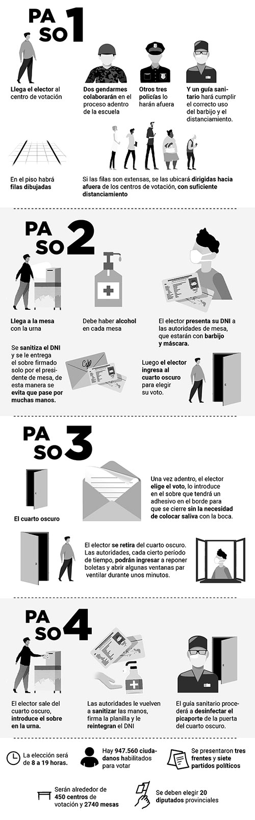 También las urnas serán sanitizadas. Una vez que el elector introduce el voto en la urna, se le devuelve su DNI sanitizado, se le aplica alcohol en la mano y también en el picaporte de la puerta del cuarto oscuro. Luego se retira de la escuela.
