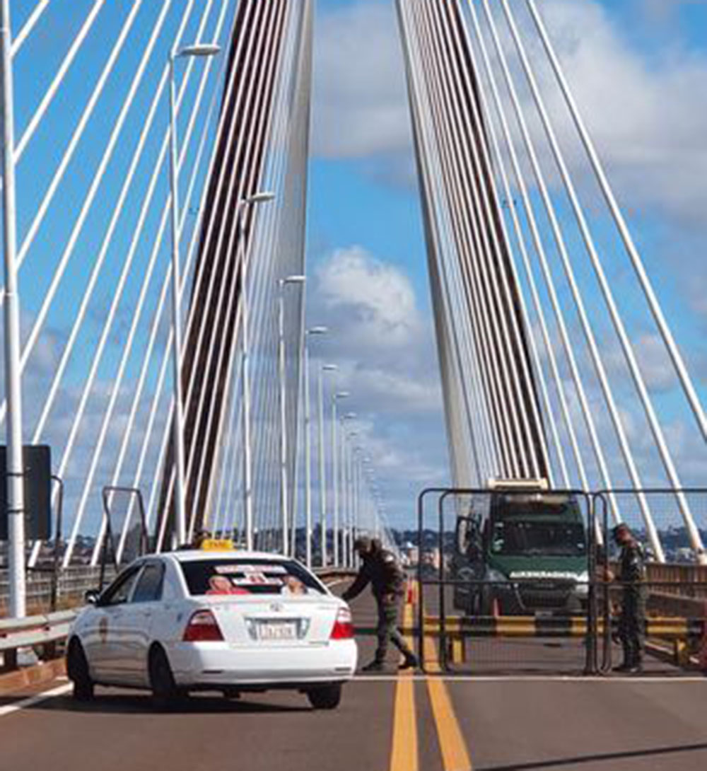 La iniciativa de la fuerza quedó plasmada en una fotografía y en la misma se observa al personal colocando la valla en el viaducto internacional que une Encarnación con Posadas.