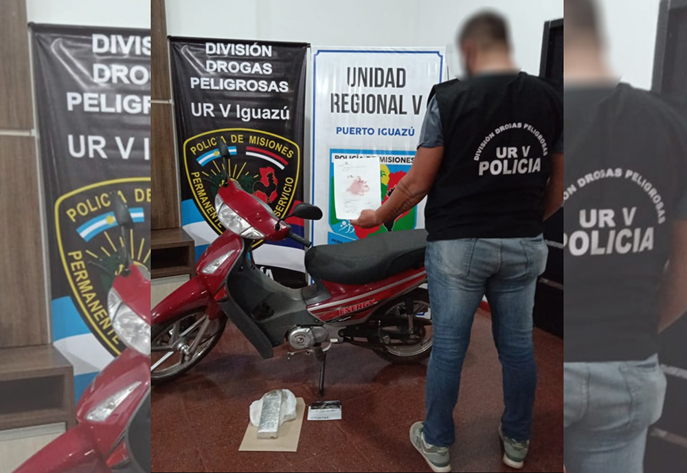 El Juzgado Federal de Eldorado, dispuso el secuestro del estupefaciente y que el conductor de la moto sea notificado de la causa por tenencia simple.