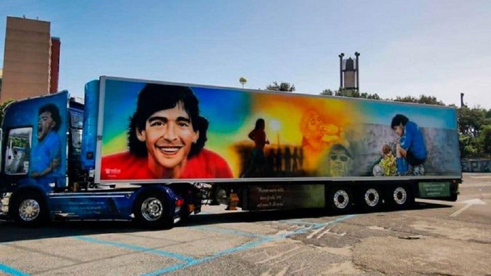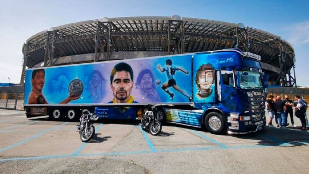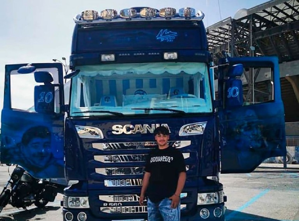 Así como alguna vez el ídolo popular interrumpió un entrenamiento de Boca cuando llegó con su Scania, en el sur de Italia uno de sus fieles tuneó su vehículo como tributo a la máxima leyenda internacional.