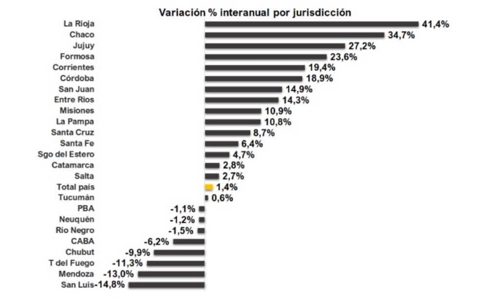 En el plano nacional, solo siete jurisdicciones mostraron incrementos reales de los salarios promedios en el sector, lideradas por Santa Cruz (+9,1%), Tierra del Fuego (+8,8%) y Formosa (+2,7%), y seguidas por Catamarca, Chaco, Entre Ríos y Chubut. En el otro extremo, San Juan (-15,3%), Corrientes (-12,2%) y Tucumán (-9,4%) tiene las mayores caídas reales del salario.
