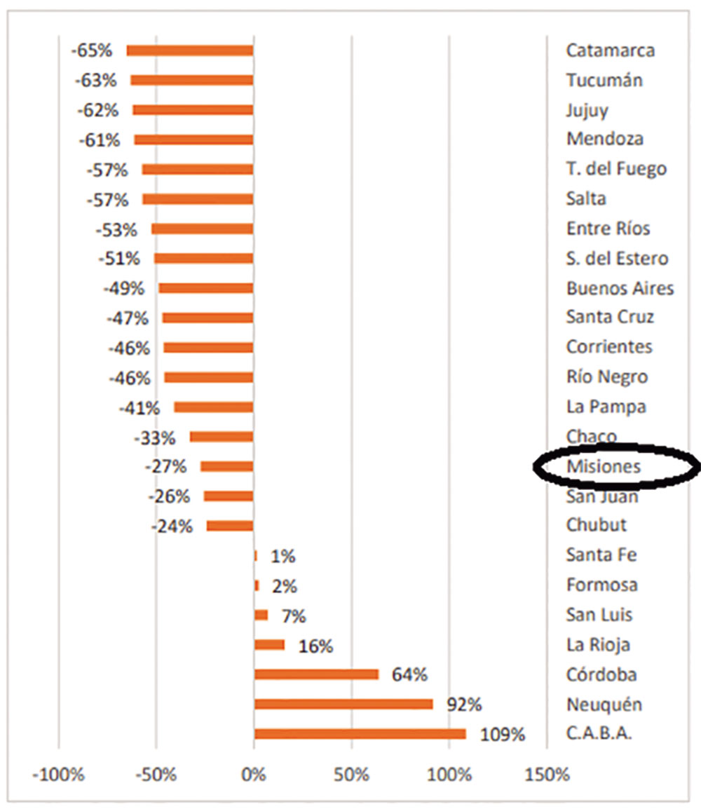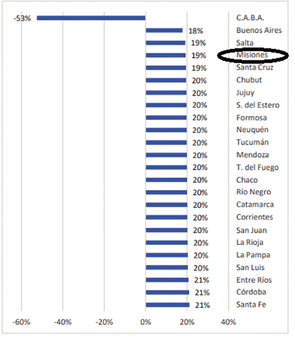 De acuerdo al cuadro “transferencias automáticas nacionales al consolidado de provincias más CABA” que figura en el informe, la variación real que tuvieron los recursos de Misiones fue de 19% al comparar con el primer cuatrimestre de 2020. Sólo CABA, Buenos Aires y Salta se ubican debajo de Misiones. Todo el resto creció entre 20 y 21%.