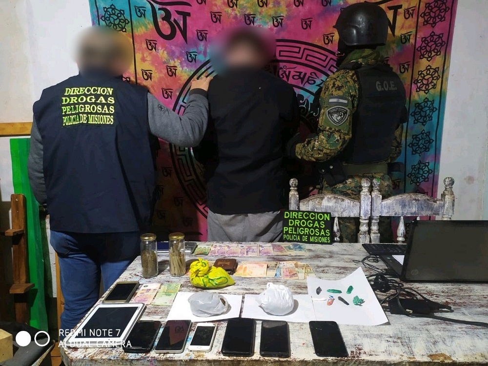 A partir de una orden dispuesta por el Juzgado Federal de Posadas, agentes encubiertos de la Dirección Drogas Peligrosas de la Policía provincial irrumpieron en dos viviendas situadas en el barrio San Gerardo y en la chacra 140 de la capital misionera, donde detuvieron a dos hombres de 30 y 31 años además de secuestrar 12 gramos de clorhidrato de cocaína fraccionados en pequeñas dosis listas para la venta, 339 gramos de marihuana, plantines de la misma droga, dos balanzas de precisión, seis teléfonos celulares y la suma de 8.850 pesos en efectivo.