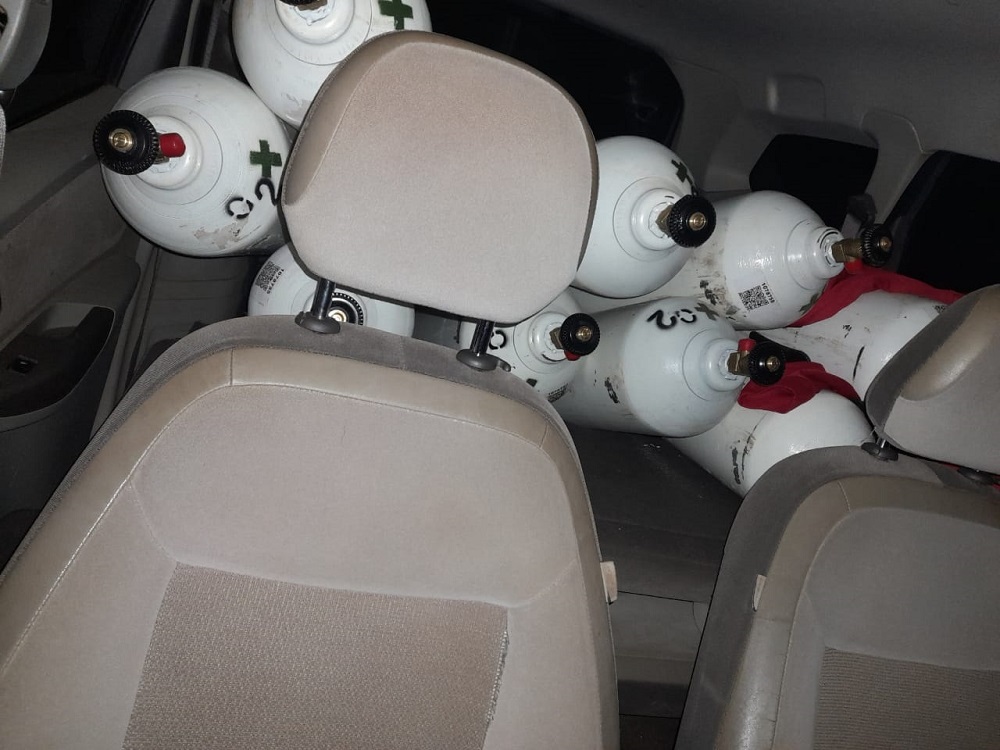 Cuando regresó hacia el vehículo para buscar sus documentos, los policías observaron que el mismo estaba cargado con 10 tubos de oxígeno. Tomaron fotografías y filmaciones de lo que transportaba.