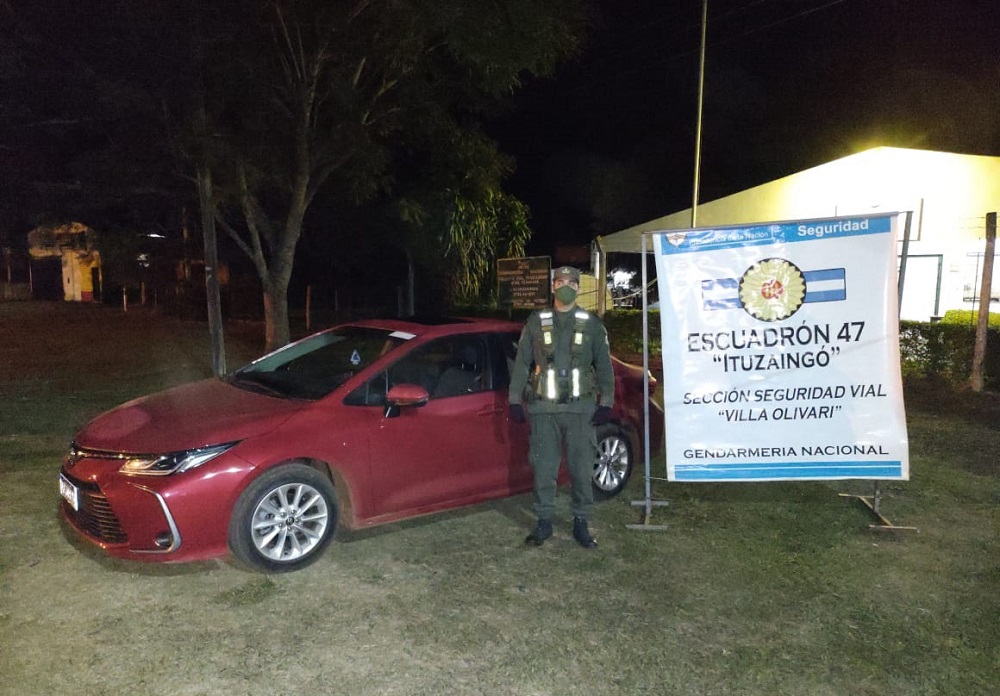 Efectivos del Escuadrón 47 “Ituzaingó” de Gendarmería Nacional que efectuaban controles sobre el kilómetro 1.232 de la ruta nacional 12 detuvieron este domingo la marcha de un automóvil Toyota Corolla en el que viajaba una pareja.