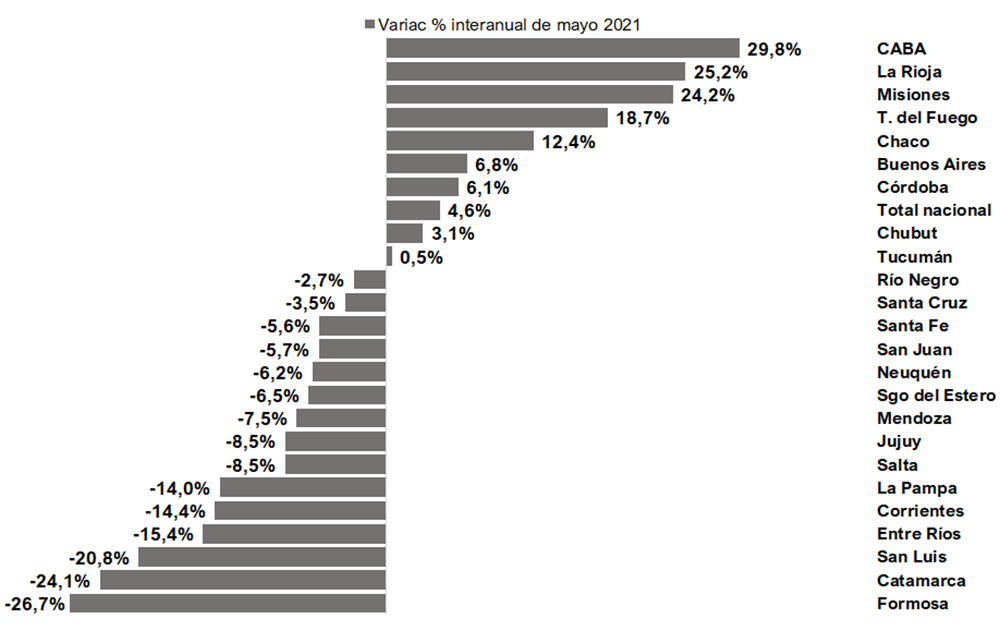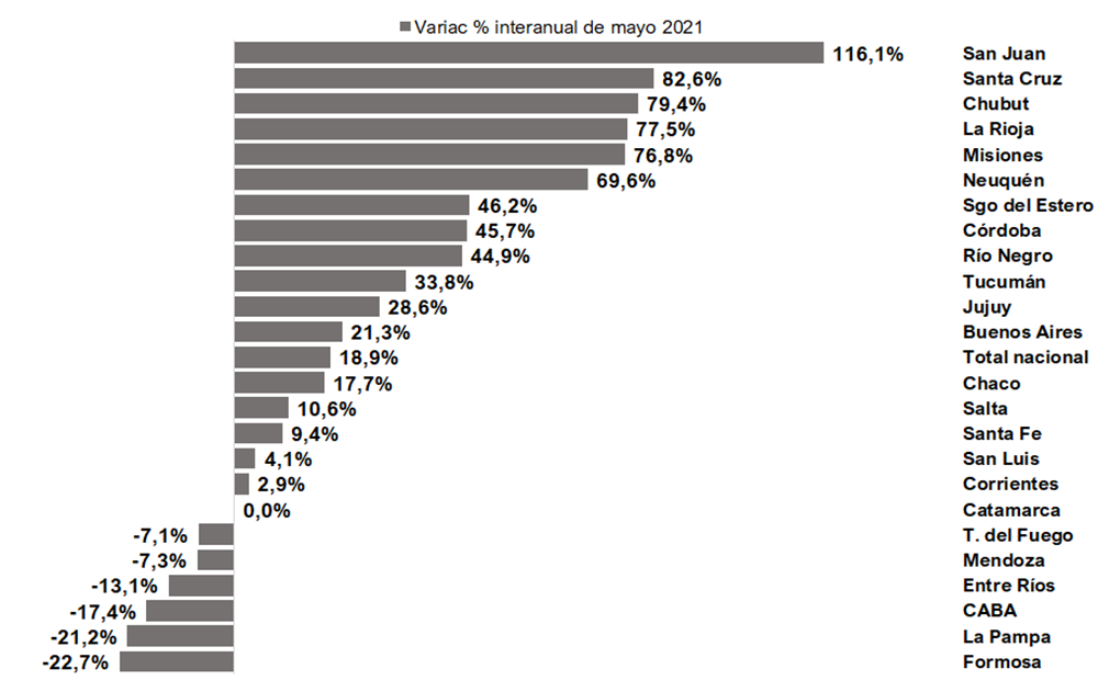 Sin embargo, la situación es distinta a nivel mensual: ninguna jurisdicción pudo crecer respecto al mes de abril, afectados en todos los casos por las medidas sanitarias. Santa Cruz, en ese marco, registró la menor caída del país con una merma del 13,3%, seguida por San Juan (-19,8%) y Misiones (-22,4%); en el otro extremo, Formosa tuvo la más alta (-55,9%).