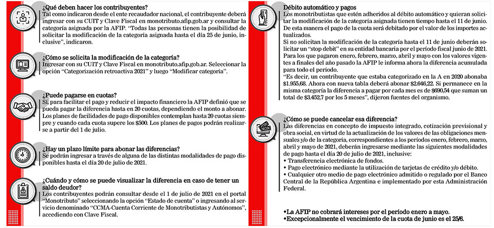 “A partir de la actualización de los parámetros y valores del monotributo, todos los contribuyentes del régimen simplificado fueron categorizados en forma retroactiva por única vez. El procedimiento refleja la categoría en la que le correspondía encontrarse encuadrado a partir del 1 de febrero de 2021”, explicaron desde el organismo.